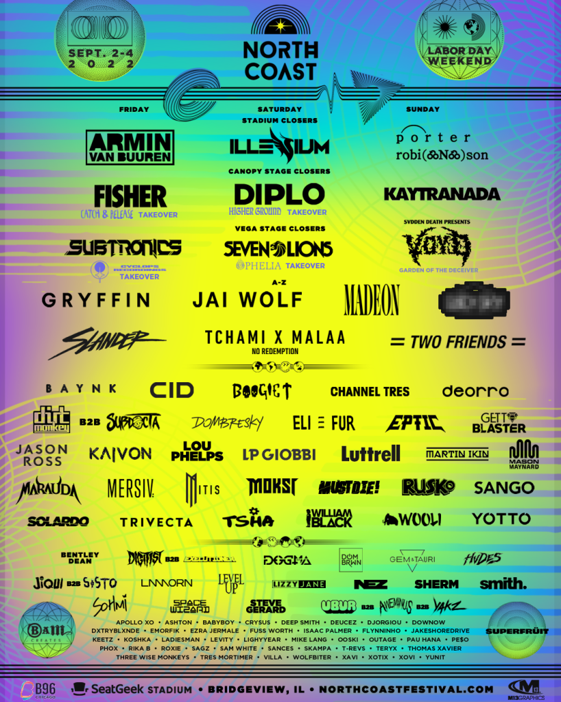 The headliners for North Coast 2022 are Armin van Buuren, Illenium, Porter Robinson, Fisher, Diplo, and Kaytranada. Other headliners include Gryffin, Seven Lions, SVDDEN DEATH, Subtronics, and Tchami x Malaa, and the lineup only gets more impressive as you make your way to the undercard.