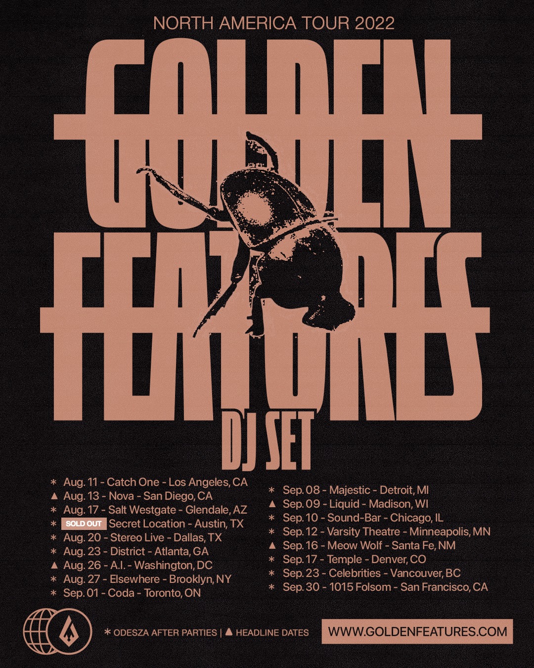 The ODESZA tour is wrapping up at the end of September, and Golden Features will headline afters at venues like Sound-Bar in Chicago and Temple in Denver. In addition to his DJ sets along The Last Goodbye Tour, Golden Features also has a few headlining shows of his own this September. He’ll be performing at Liquid in Madison, Wisconsin, and Meow Wolf in Sante Fe, New Mexico. With new tracks and headlining sets across America in 2022, Golden Features has established himself as a top artist to watch in the electronic music scene.