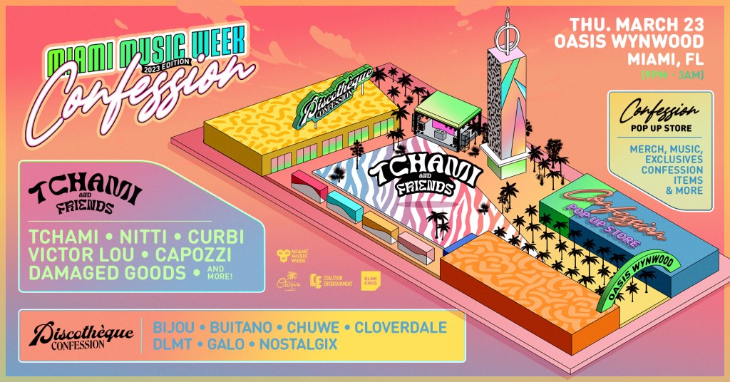 Tchami’s Confession label has been a leader of the bass house and future house genres since their inception. Confession is bringing a massive lineup to Oasis Wynwood for Miami Music Week 2023. With two stages and a pop up store with exclusive merch, Thursday night with Tchami and friends is a highlight of MMW. Tchami, Nitti, Curbi, Victor Lou, Capozzi, and Damaged Goods will perform on the outdoor stage, while Bijou, Buitano, Chuwe, Cloverdale, DLMT, Galo, and Nostalgix are scheduled to play at the Confession Discotheque indoors. VIP & GA tickets are available.