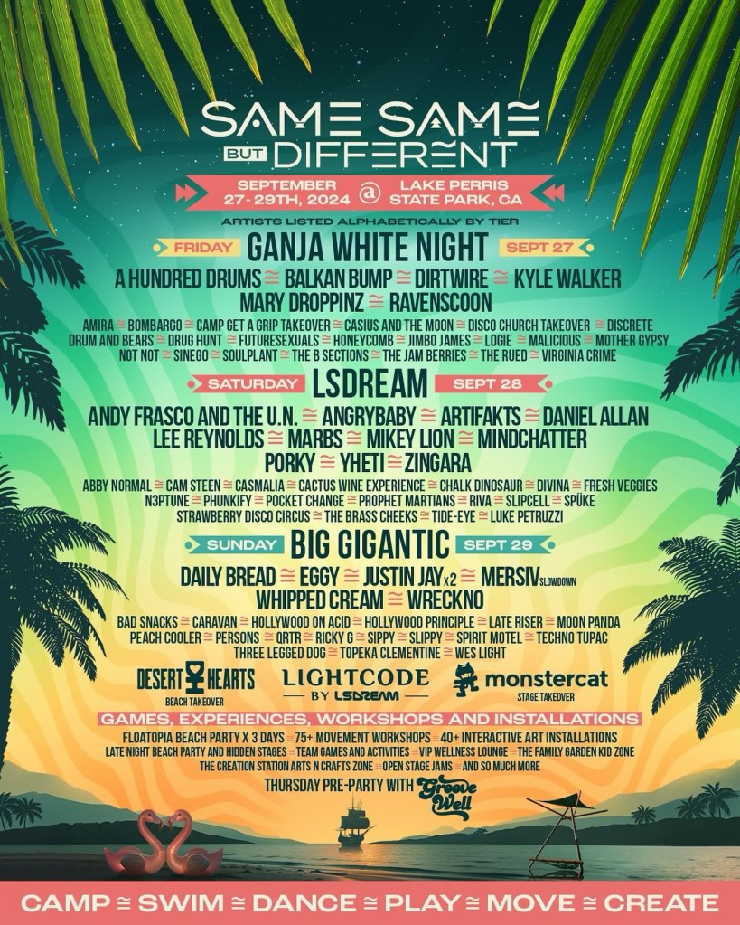 Same Same But Different Festival also features three label showcases. Desert Hearts will have a beach takeover, Monstercat will have a stage takeover, and Lightcode by LSDream is also being featured. In addition to the label showcases, the festival will feature the floatopia beach party, 75+ movement workshops, and 40+ interactive art installations. Be on the lookout for late night beach parties, hidden stages, and activities like arts and crafts and team games.