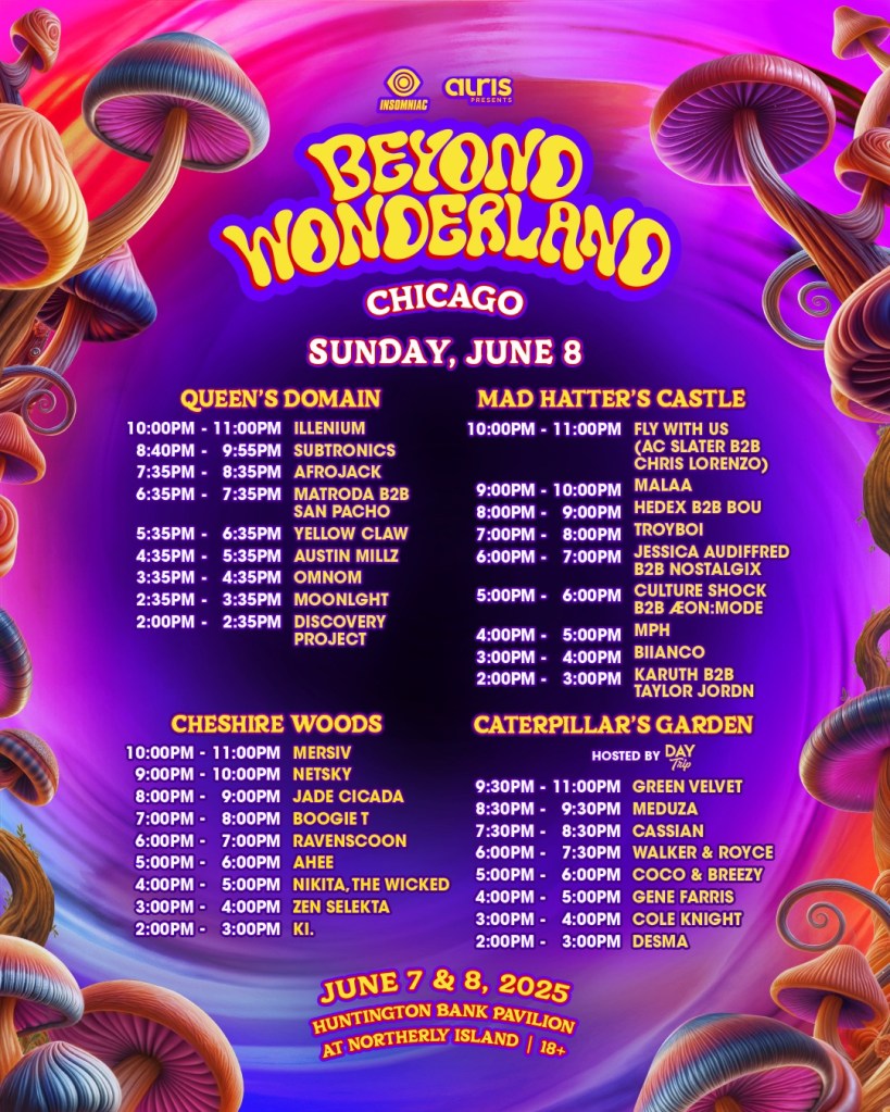 There are also stage takeovers listed on the lineup from Insomniac’s brands like Bassrush, Day Trip, and Insomniac Records. The two-day festival weekend will take place on June 6th-7th, 2025. Beyond Wonderland uses the entirety of the Northerly Island area, including both Huntington Bank Pavilion and the surrounding fields.