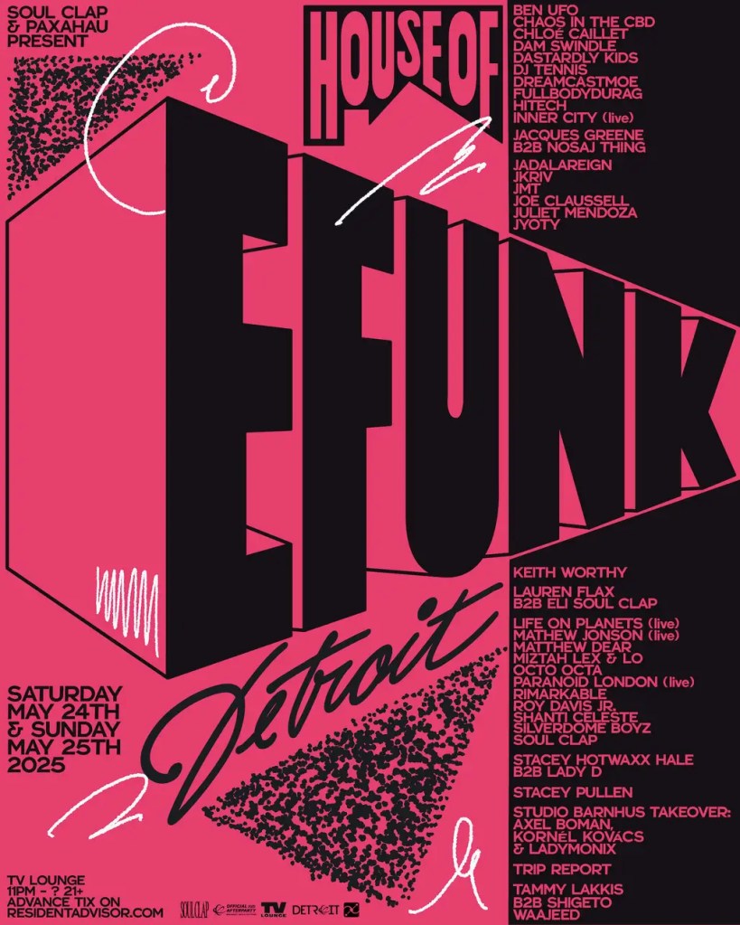 Each year, Soul Clap brings their House of EFUNK party to TV Lounge for a nonstop multi-day event featuring a wide range of artists. The show starts on Saturday and goes all the way until 11 AM on Monday morning. The two-stage outdoor setup at TV Lounge is a great place to watch the sunrise during Movement weekend. Some highlights on the 2025 House of EFUNK lineup are Ben UFO, DJ Tennis, Matthew Dear, Octo Octa, Paranoid London, Stacey Pullen, and Soul Clap. Set times