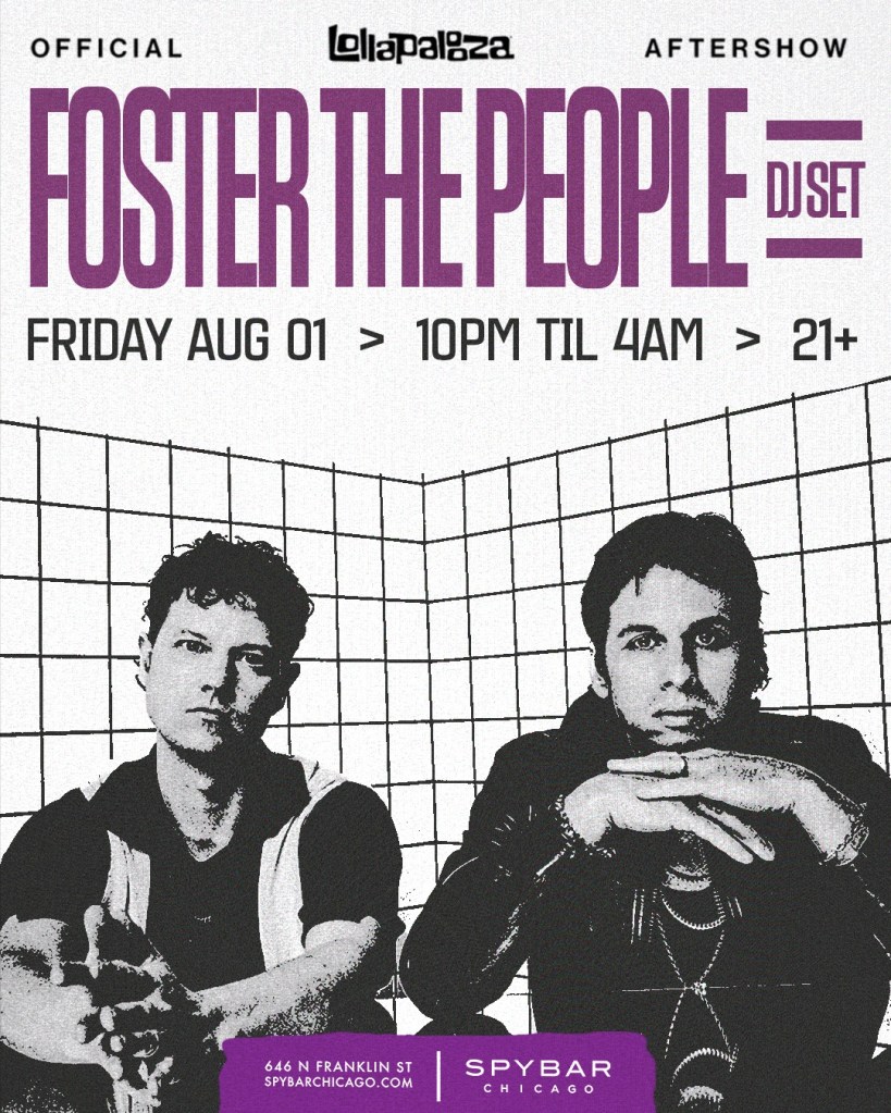 Here’s an interesting addition to the afterparty lineup (the newly announced ones are highlighted yellow on the graphic above). Foster The People, the influential indie band of “Pumped Up Kicks” fame, will head to the Spybar basement after the festival on Friday. Seeing a Foster the People show at an iconic house music club will be a once-in-a-lifetime experience for their fans. It’s the type of event that only happens during a special weekend like Lollapalooza.