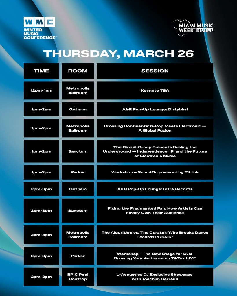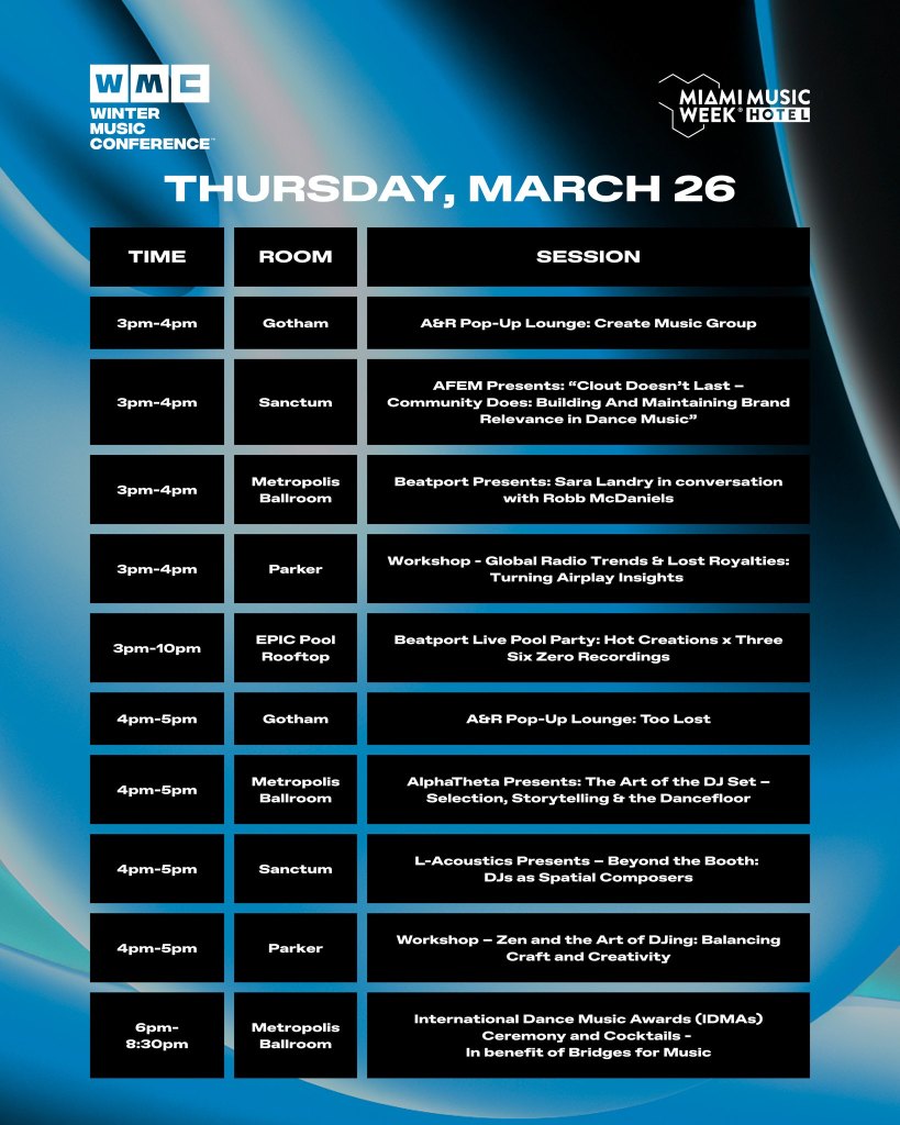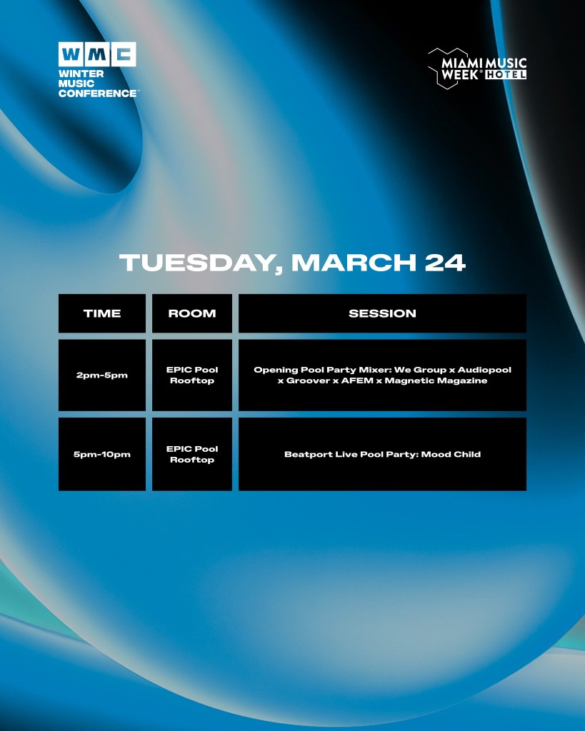 Now held at the Kimpton EPIC Hotel, the 36th edition of WMC will feature a three day rooftop pool party series plus presentations, panel discussions, networking opportunities, and interactive brand activations. The Beatport x WMC pool parties from Tuesday to Thursday of Miami will be announced later. The 2026 conference will also see the return of the International Dance Music Awards (IDMAs).